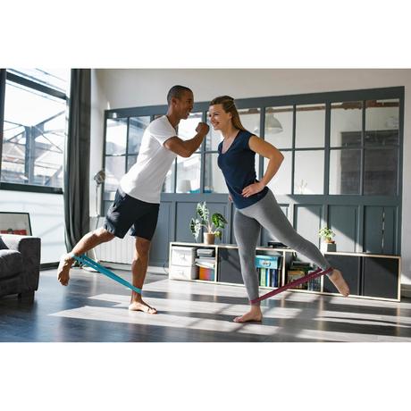 Altrettanto efficaci ma meno pesanti rispetto ai manubri, le fasce con resistenza sono un'alternativa più pratica e leggera per tonificarsi. Più morbide, sono raccomandate dal nostro kinesiterapista, per qualunque livello di pratica. Inoltre puoi modificare il livello di difficoltà in funzione della fascia scelta (facile/intermedio/difficile).