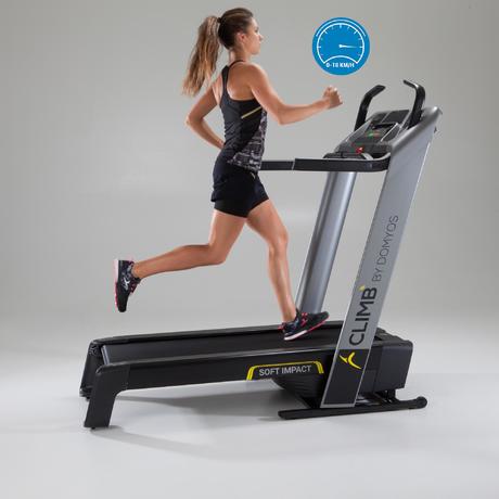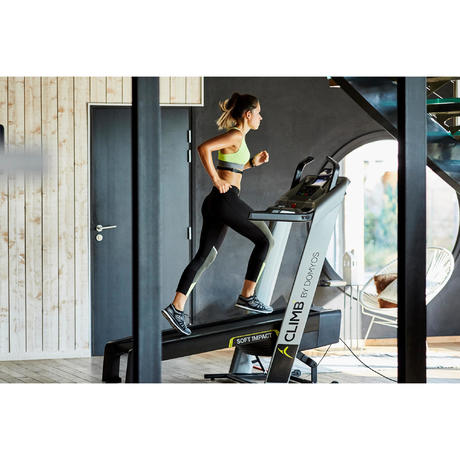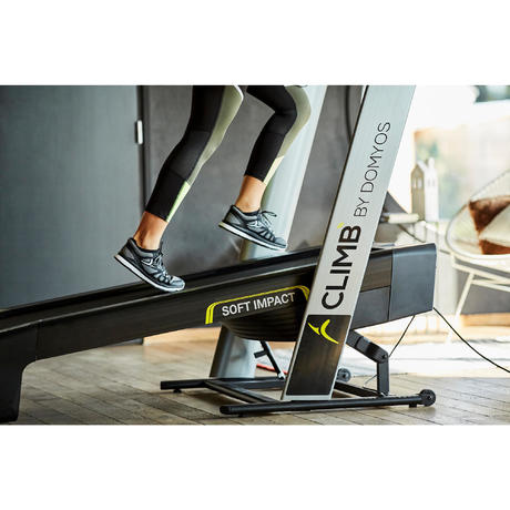 Il sistema di ammortizzamento del tapis roulant CLIMB by Domyos è stato studiato per permettere un buono slancio ed una corsa dinamica. Correre sul tapis roulant preserva maggiormente la articolazioni rispetto al running su suolo duro.