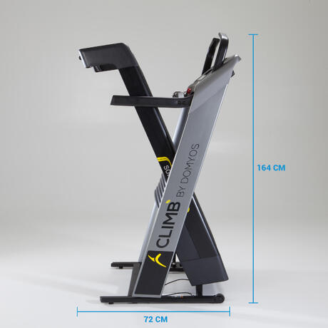 Il tapis roulant CLIMB BY DOMYOS è pieghevole, per permetterti di guadagnare spazio quando non lo usi. Una volta chiuso, la superficie necessaria a terra per riporre il tapis roulant è di 72x89 cm. Il volume è stato studiato dai nostri ingegneri per garantire un buon compromesso tra compattezza e stabilità.