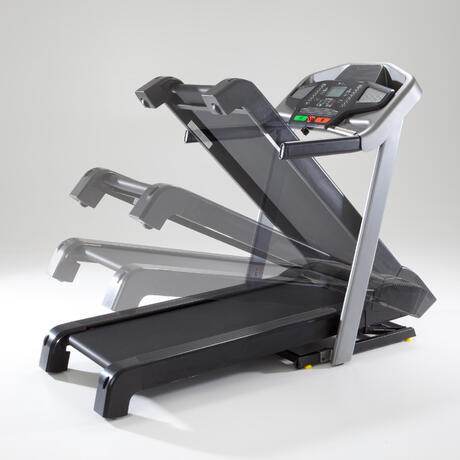 Il tapis roulant T900 è pieghevole, per permetterti di guadagnare spazio quando non lo usi. Una volta chiuso, la superficie necessaria a terra per riporre il tapis roulant è di 133x88 cm.