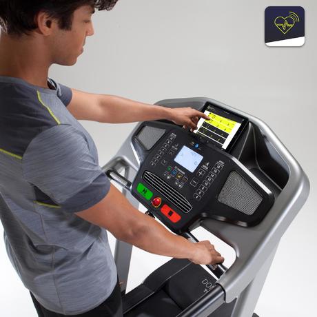 Il tapis roulant T900 è venduto con una fascia toracica che permette di misurare la frequenza cardiaca e con sensori manuali per una stima puntuale durante la seduta.